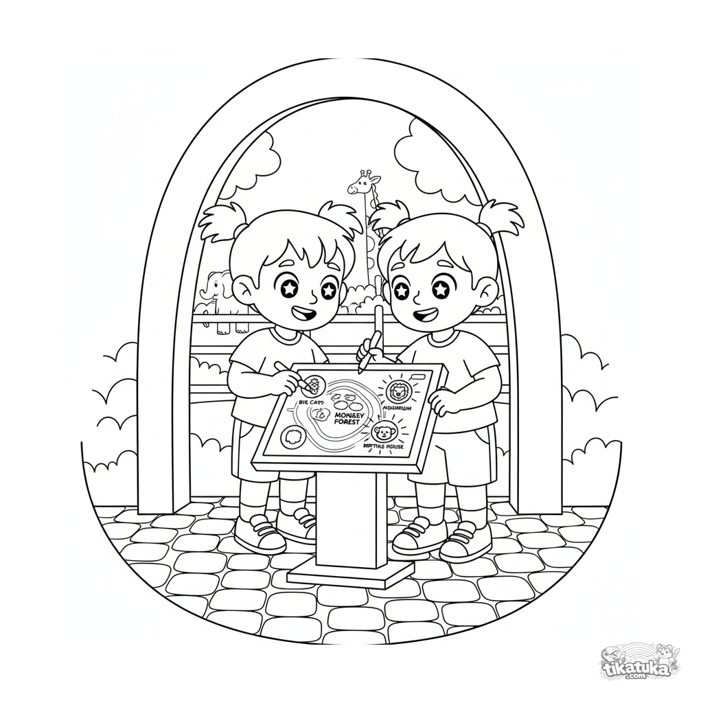 Página para colorir para crianças de 4-6 anos: crianças usam um mapa interativo de touchscreen na entrada do zoológico para planejar sua rota.