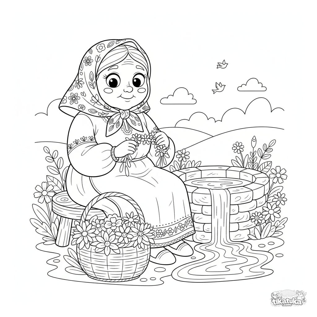 Página para colorir para crianças 7-9: uma avó com lenço trança uma grinalda de flores junto ao poço. Cena no estilo bordado folclórico.