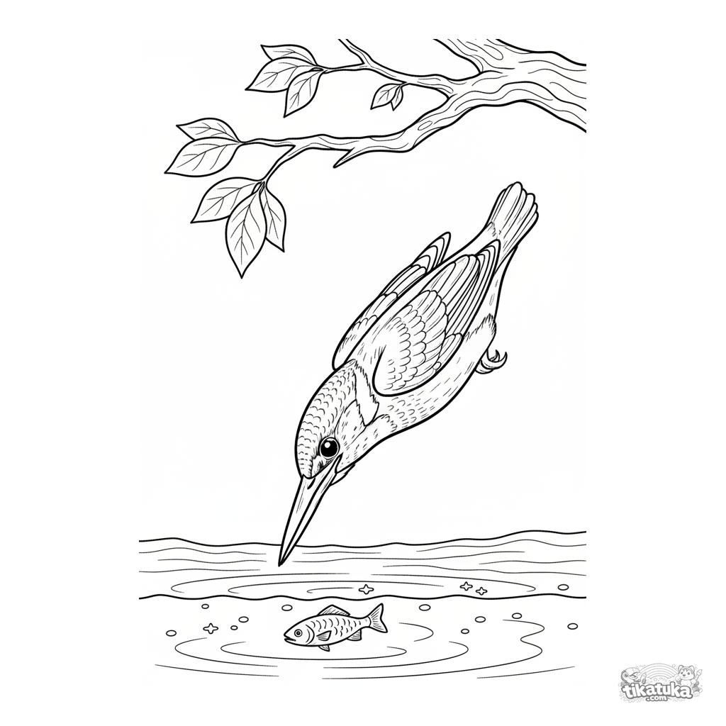 Página para colorir para 7-9 anos: um martim-pescador em um mergulho rápido mergulha em direção à superfície de um riacho atrás de um peixe. Cena de ação.
