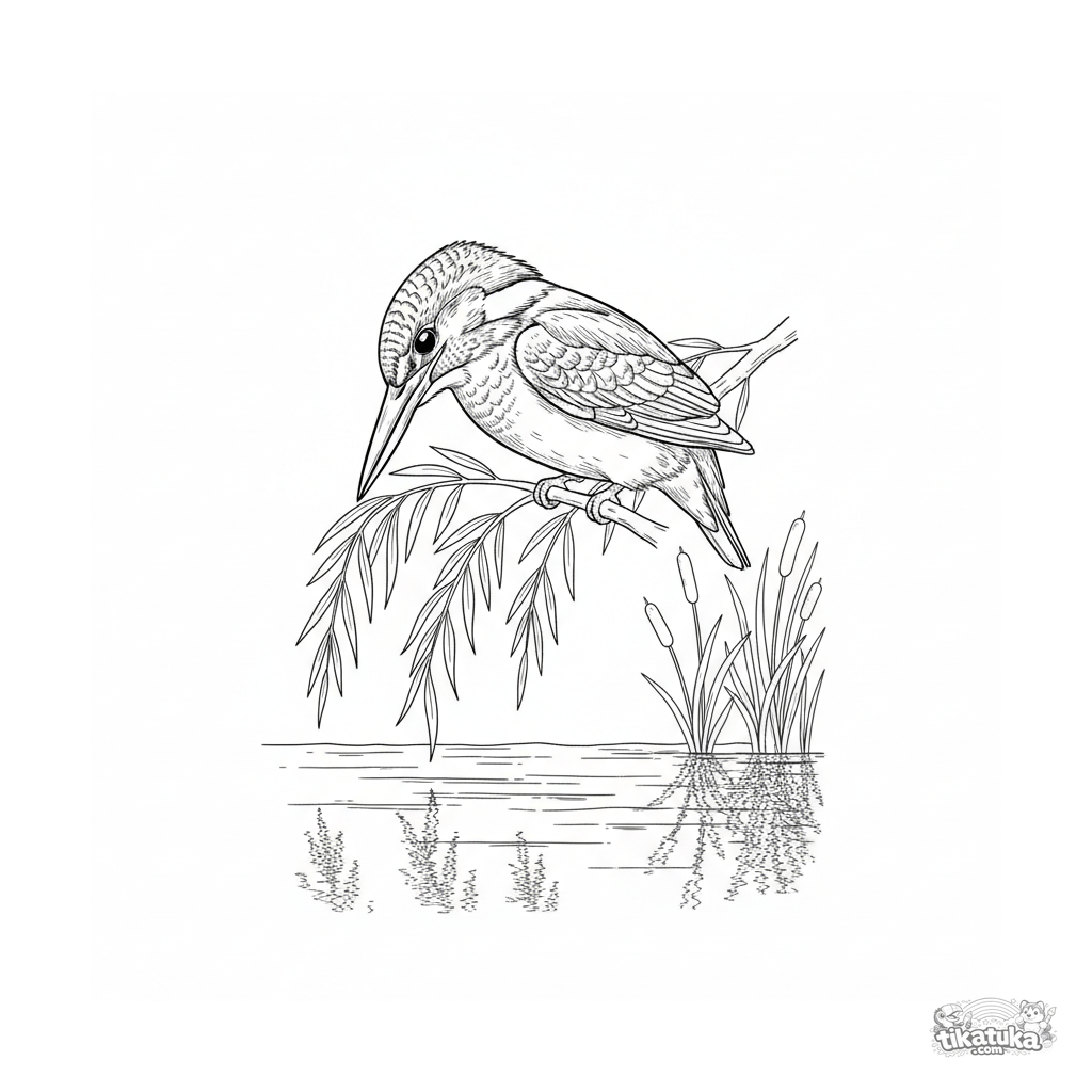 Página para colorir detalhada para 10-12 anos: um guarda-rios num galho sobre um riacho. Estilo gravura vintage com linhas limpas.
