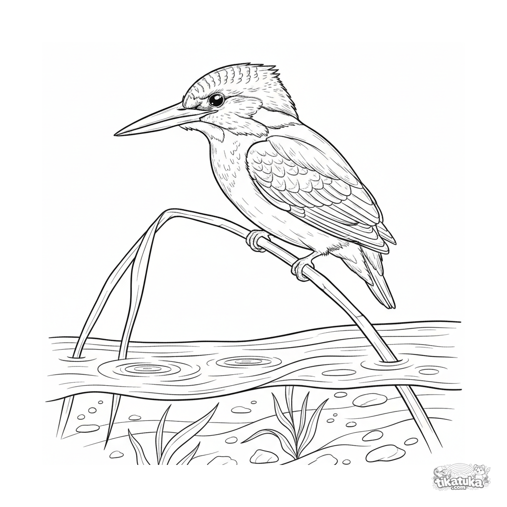 Página detalhada para colorir para crianças 10-12 anos: um guarda-rios em pose natural num junco junto a um riacho. Estilo realista de guia de campo.