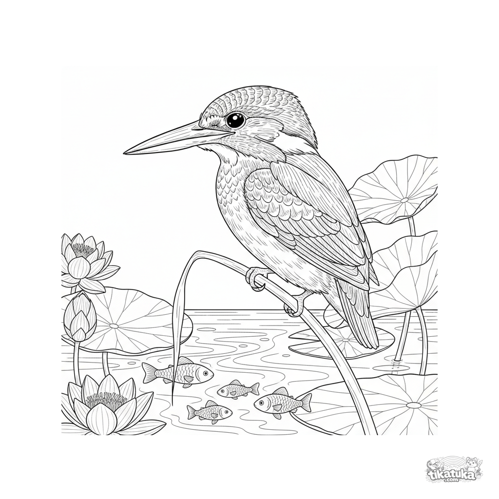 Página detalhada para colorir para crianças 10-12: um martim-pescador em um junco sobre um riacho, à espera de presa. Contornos realistas, penas, plantas aquáticas.
