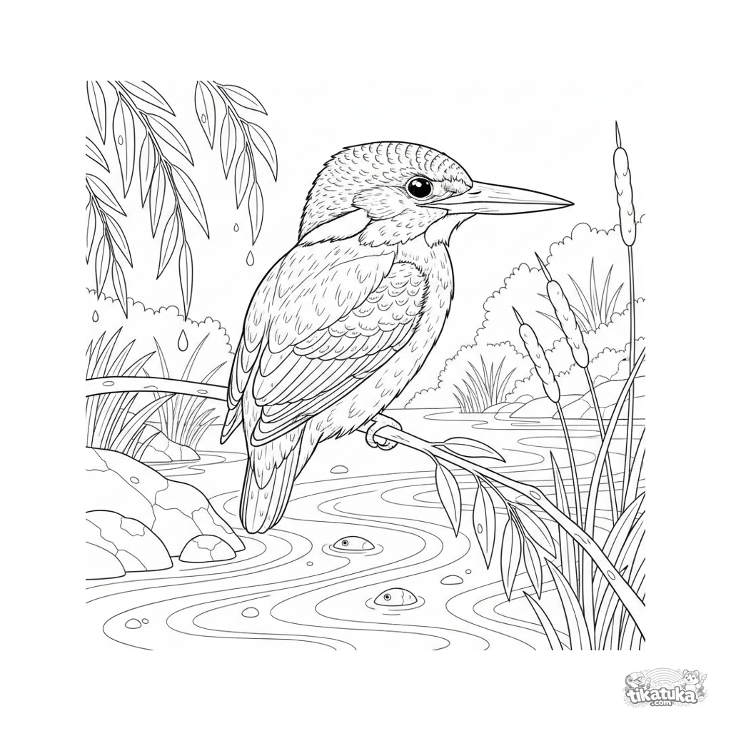 Página para colorir para crianças mais velhas 10-12: um martim-pescador detalhado empoleirado em um galho sobre um riacho claro. Ilustração realista de pássaro.