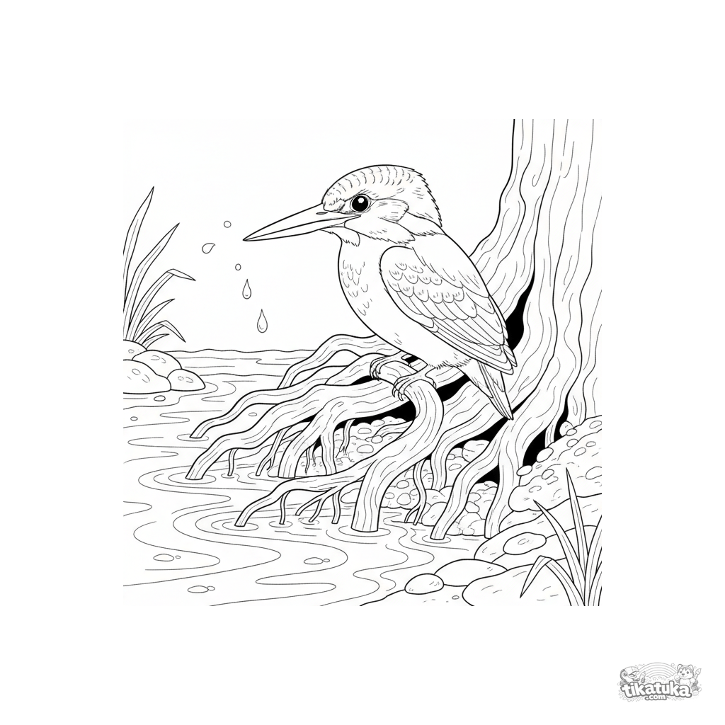 Página para colorir para crianças de 4-6 anos: um guarda-rios com bico longo empoleirado em raízes de salgueiro sobre um riacho claro, observando a água.