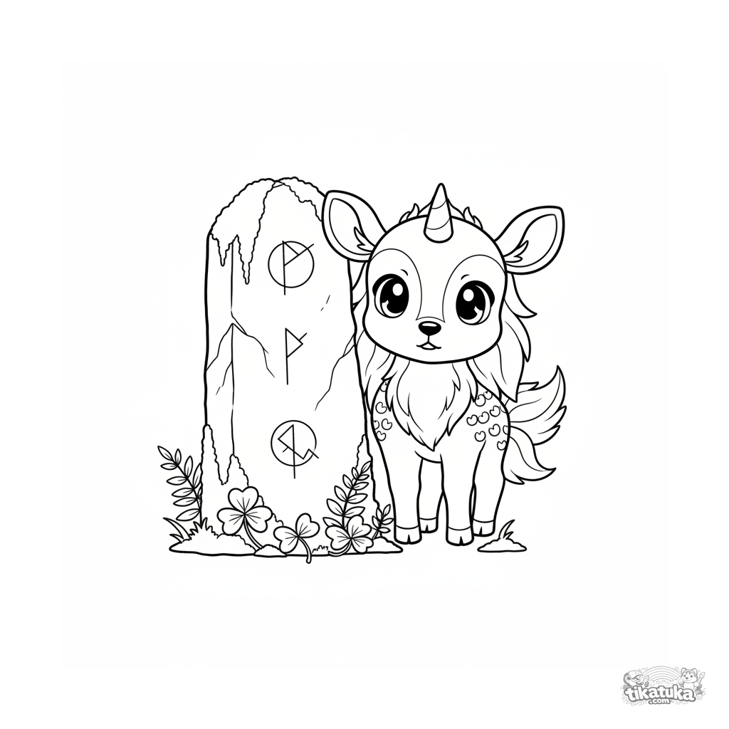 Página para colorir para crianças de 4-6 anos: um tímido bezerro de kirin espreita por trás de uma enorme pedra rúnica musgosa. Assunto principal claro, fundo simples, detalhe moderado.