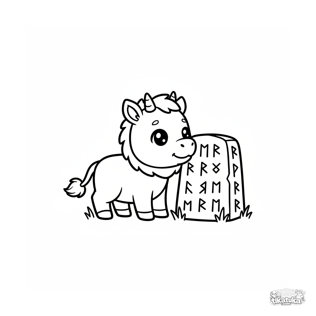Página simples para colorir para crianças de 2-3 anos: um fofo potro de kirin está perto de uma grande pedra rúnica. Formas grandes e claras, margens amplas para primeiros lápis de cor.