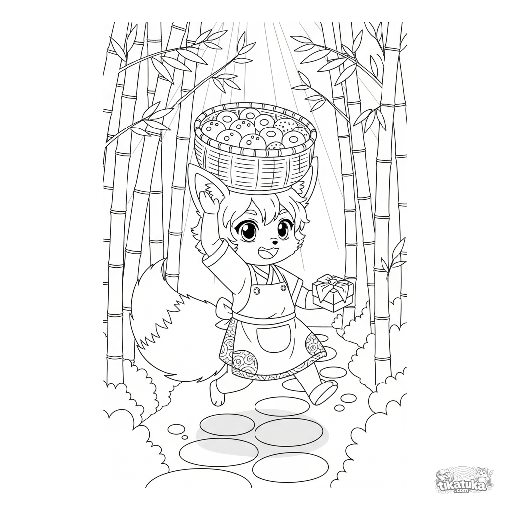 Página para colorir anime fofa: um kitsune entrega uma cesta de mochi por uma floresta de bambu ensolarada. Cena detalhada para 10-12 anos.