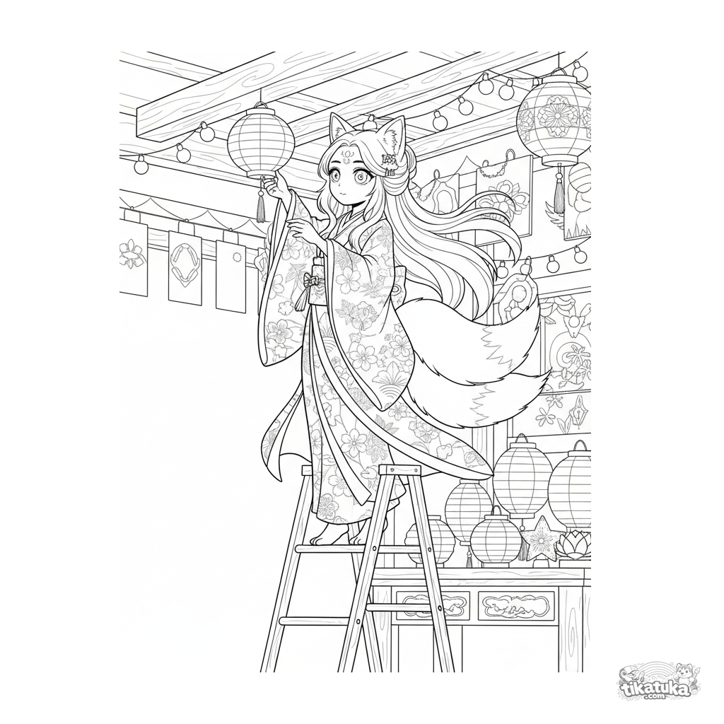 Página para colorir detalhada para 10-12 anos: uma garota kitsune pendurando lanternas de papel em um salão festivo. Contornos intrincados, elementos de roupa e decoração, figura completa.