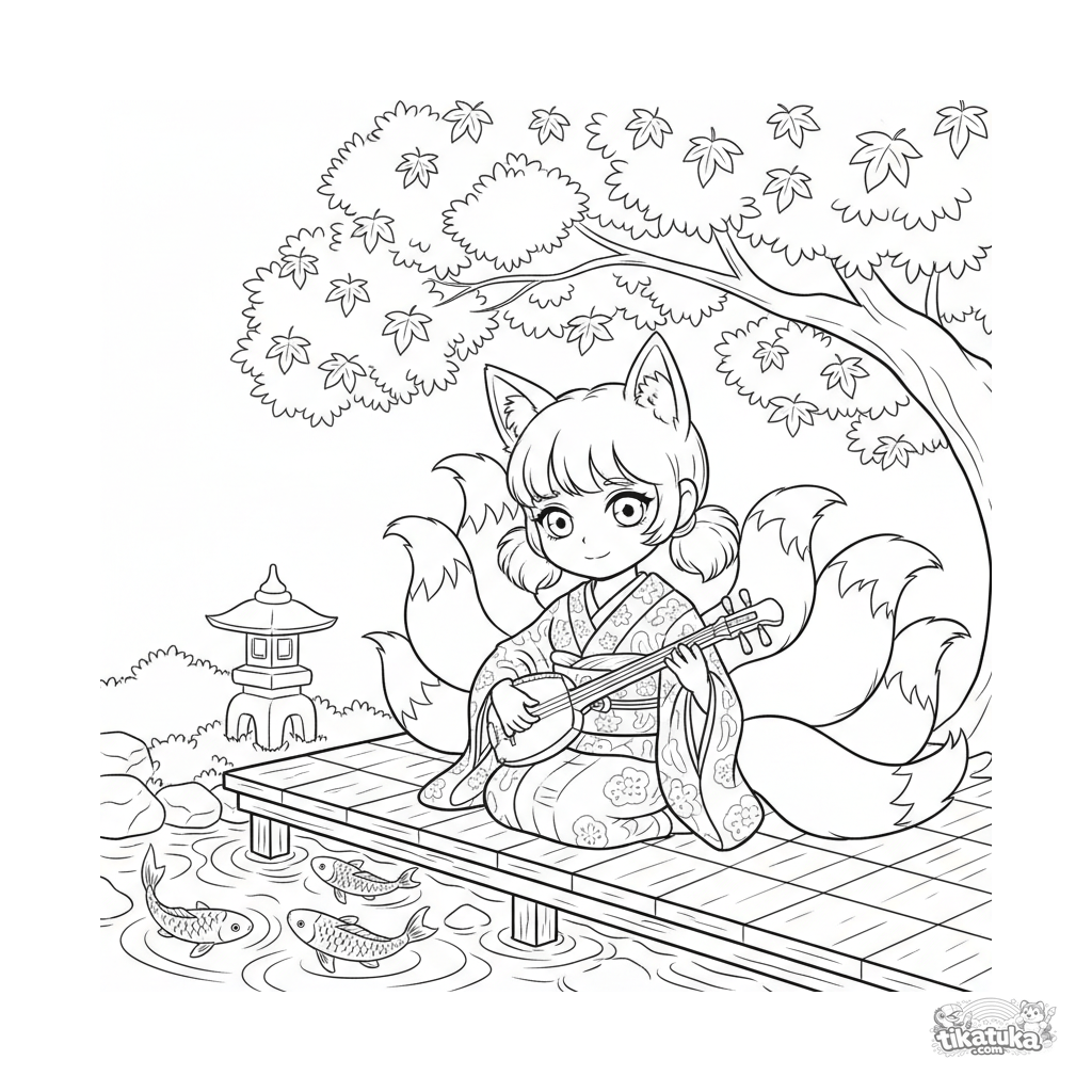 Página para colorir anime detalhada: uma garota espírito kitsune com caudas fofas toca um shamisen tradicional em um jardim de outono. Cena complexa com fundo para crianças de 10-12 anos.