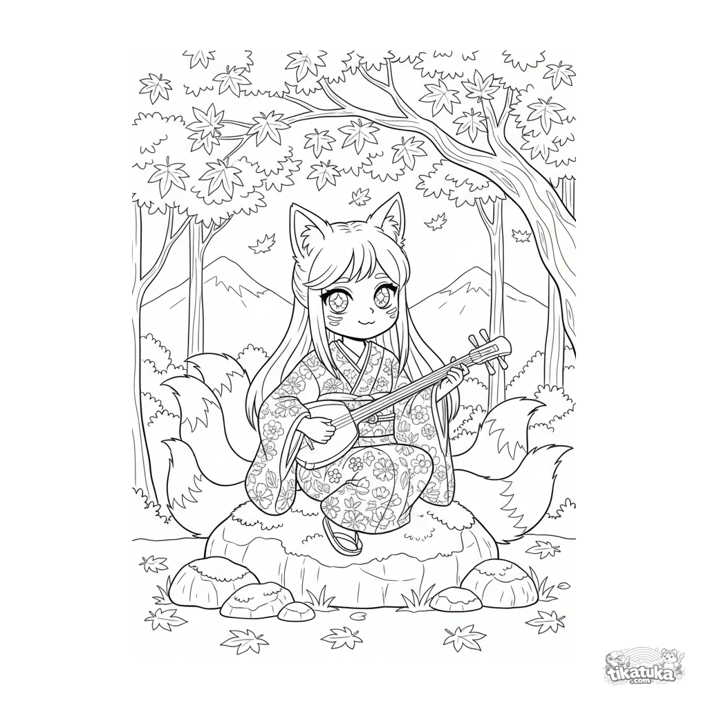 Página para colorir anime: uma garota espírito kitsune toca um shamisen tradicional sob uma árvore de bordo de outono. Cena florestal detalhada com folhas e caudas fofas para 10-12 anos.