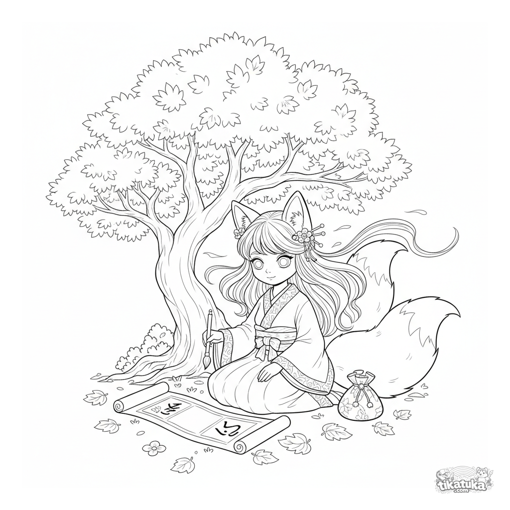 Página para colorir no estilo anime: uma menina espírito raposa pratica caligrafia sob um bordo de outono. Cena detalhada para 10-12 anos com fundo intrincado.