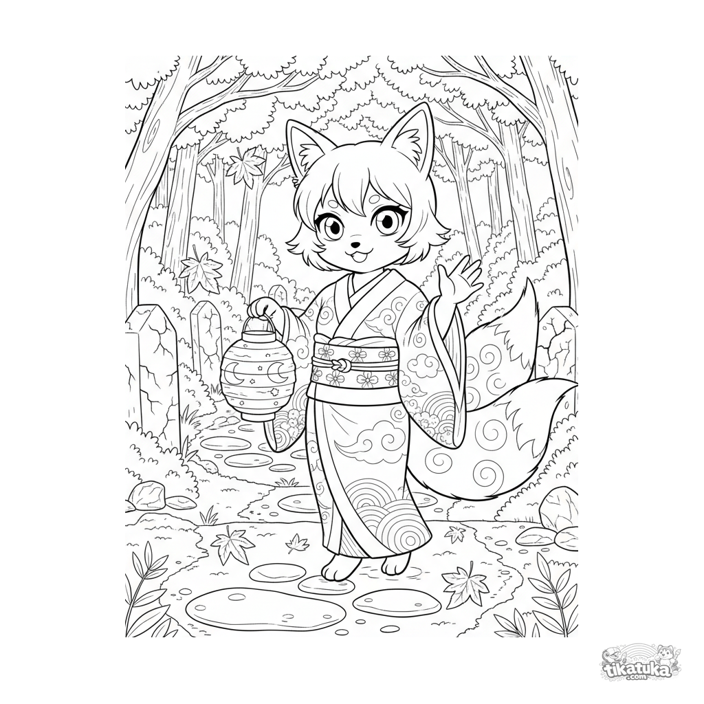Página detalhada para colorir anime: um espírito kitsune de duas caudas guia por uma trilha na floresta de outono. Para 10-12 anos, com folhas de bordo flutuantes, marcadores de pedra e uma lanterna brilhante.