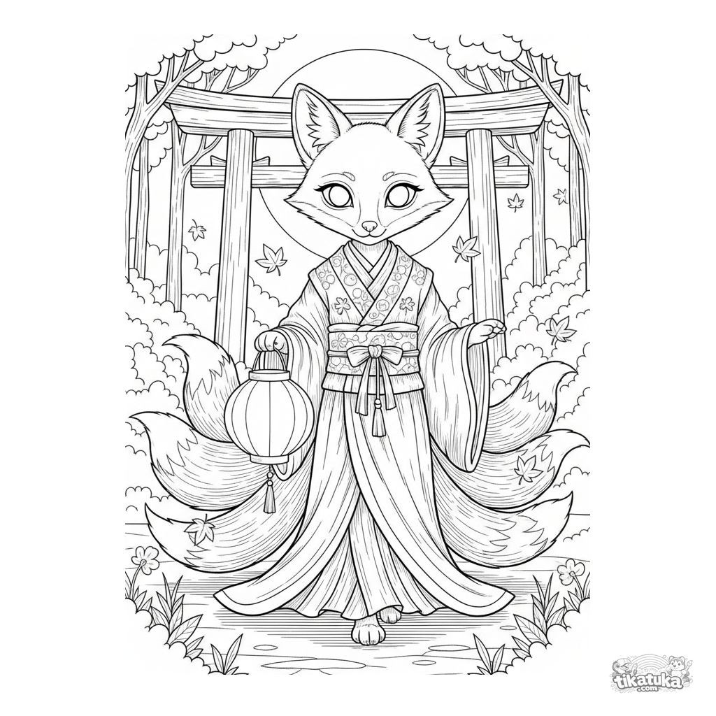 Página para colorir para crianças mais velhas: um espírito raposa kitsune com vestes carrega uma lanterna de papel por uma trilha na floresta. Cena detalhada do folclore japonês com folhas de bordo.