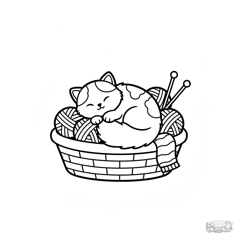 Página para colorir simples para crianças pequenas de 2-3 anos: um gatinho fofo dorme em uma cesta cheia de novelos de lã, com agulhas de tricô e um cachecol por perto.
