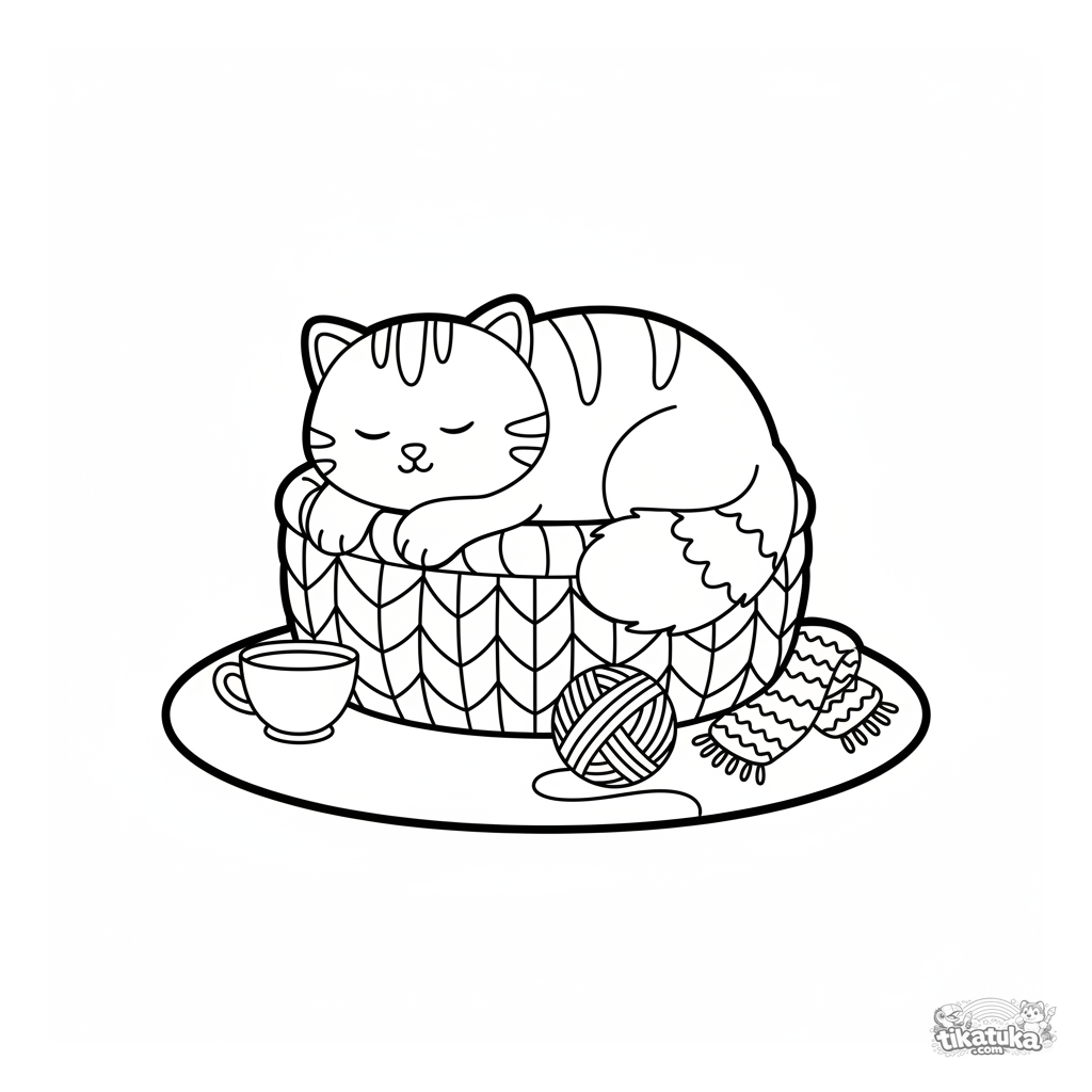 Página para colorir fácil para crianças pequenas de 2-3 anos: um gatinho fofinho dormindo em uma cesta de tricô aconchegante com um novelo de lã por perto.