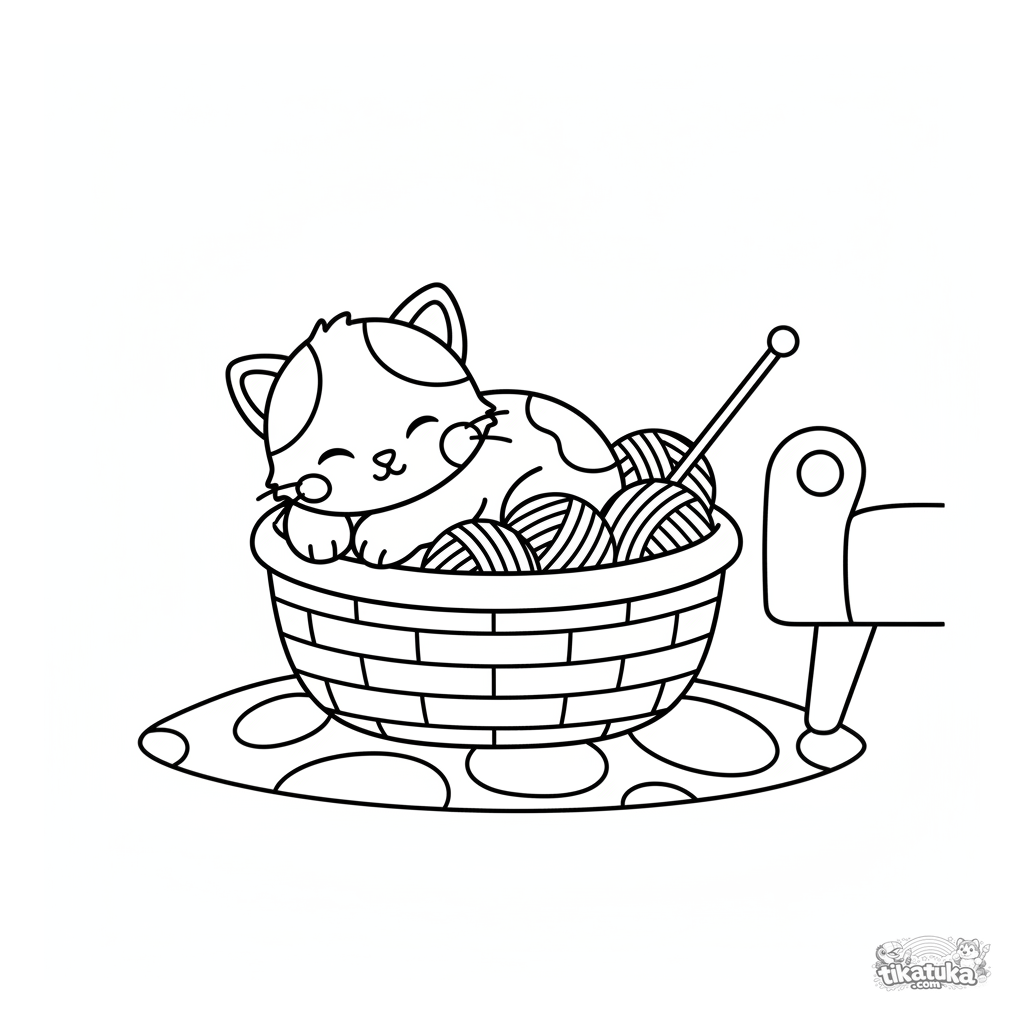 Página simples para colorir para crianças pequenas 2-3: um gatinho fofo dorme em uma cesta de tricô com novelos de fio. Formas grandes.