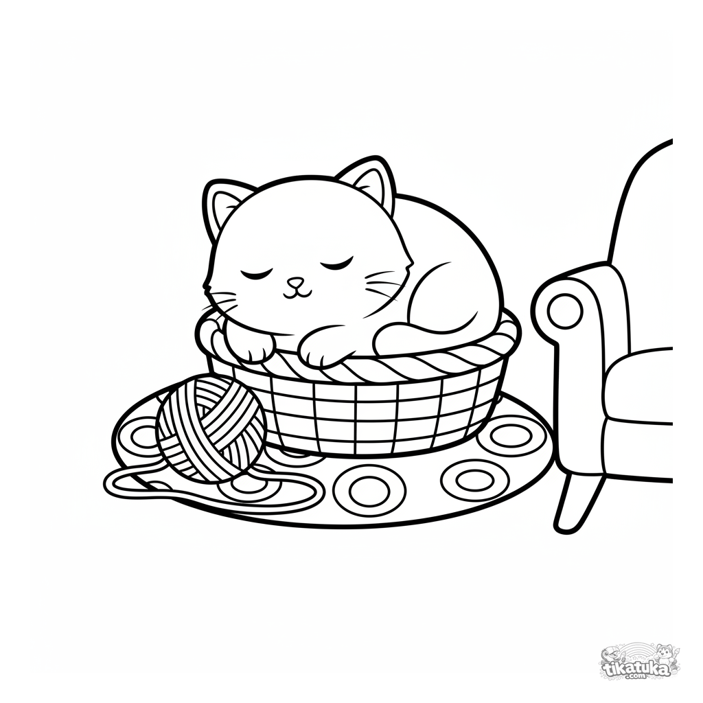 Página para colorir simples para crianças de 2-3 anos: um gatinho fofo dorme profundamente em uma cesta de tricô ao lado de um novelo de lã. Formas grandes, detalhes mínimos.