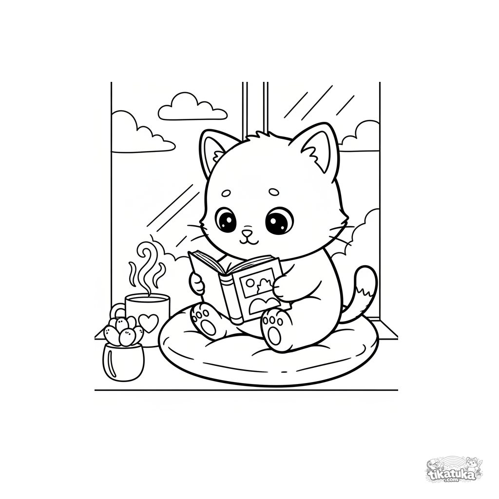 Página para colorir para crianças de 4-6 anos: um gatinho fofinho lê um livro em uma almofada macia em um cantinho aconchegante e ensolarado da janela com uma xícara de chá.
