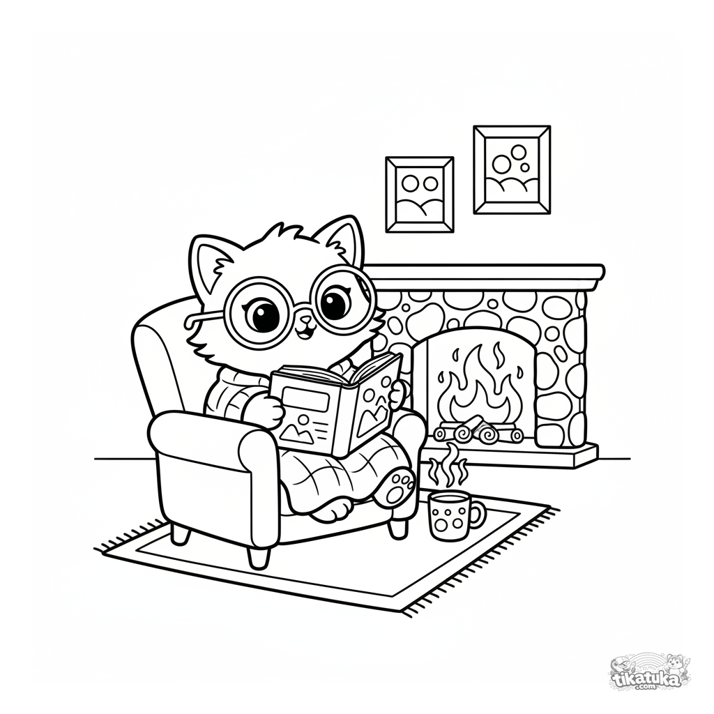 Página para colorir para crianças: um gatinho fofo com óculos lê um livro em uma poltrona aconchegante perto da lareira. Detalhe equilibrado e atmosfera quente.