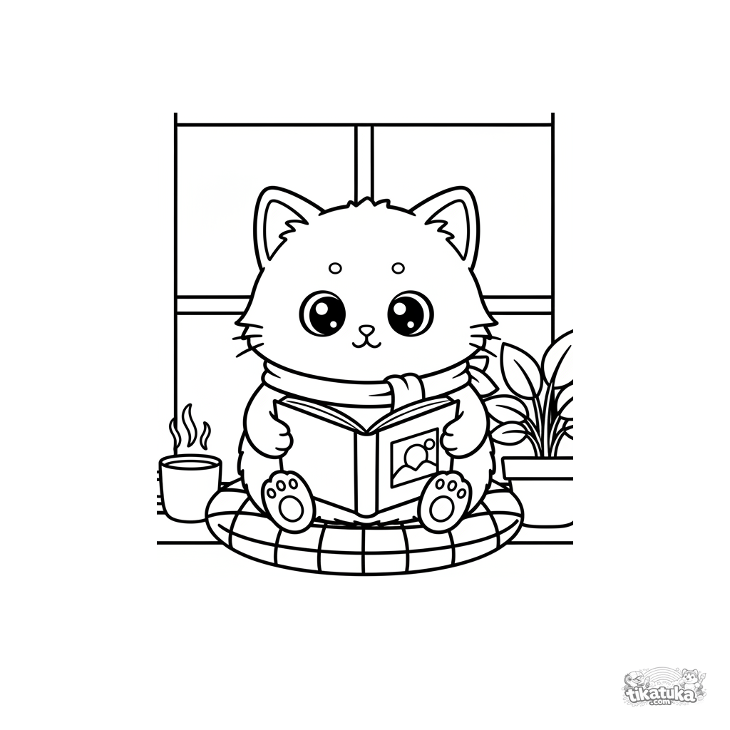 Página para colorir fácil para bebês de 2-3 anos: um gatinho fofo com cachecol senta-se em um cantinho aconchegante da janela, absorto lendo um livro grande.