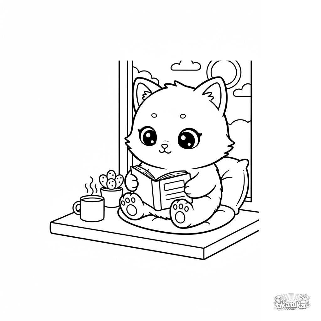 Página para colorir para crianças 4-6: um gatinho fofo e fofinho lê um livro em uma almofada macia em um aconchegante nicho de janela. Detalhe equilibrado, estilo kawaii.