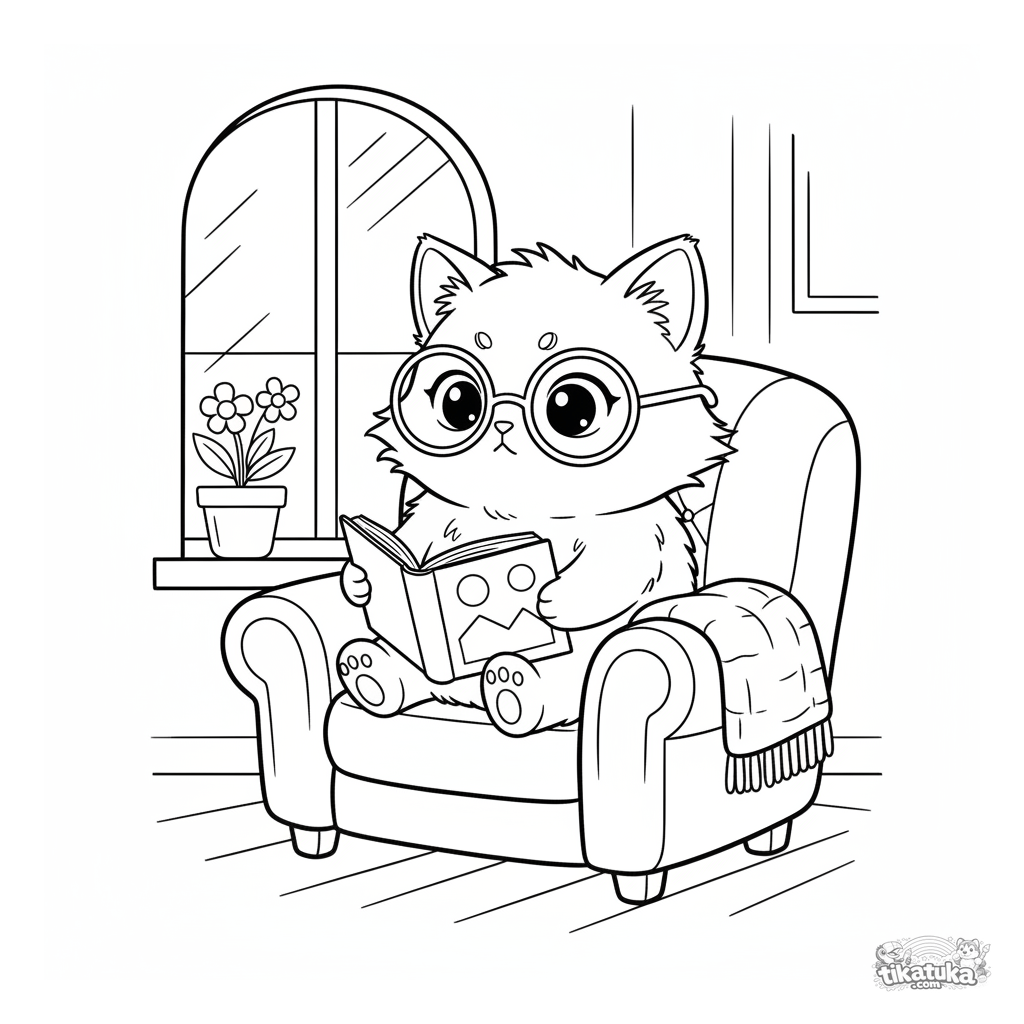 Página para colorir para crianças 4-6: uma cena aconchegante de um gatinho fofo com óculos lendo atentamente um livro em uma grande poltrona fofa ao lado de uma janela ensolarada.