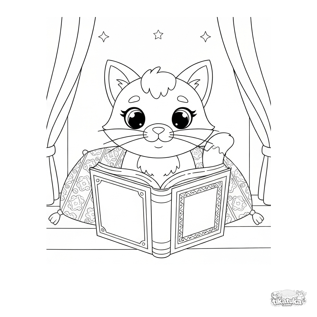 Um gatinho fofo senta-se numa almofada e olha com curiosidade para um grande livro aberto. Pinte esta cena aconchegante!