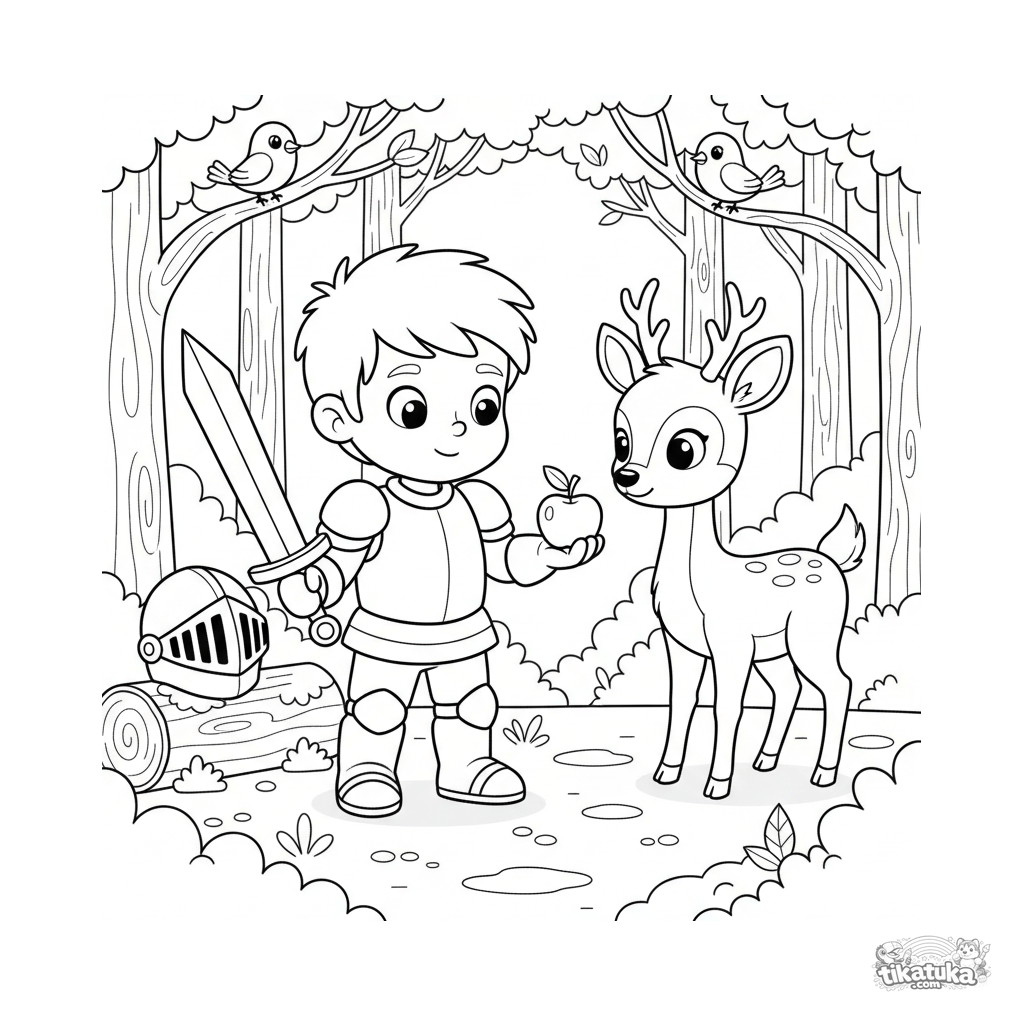 Página para colorir para meninos de 4-6 anos: um jovem cavaleiro na floresta alimenta um cervo com uma maçã.