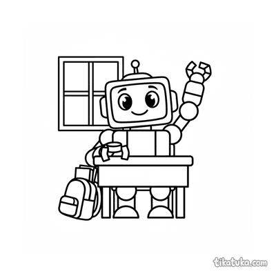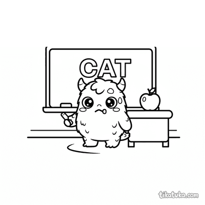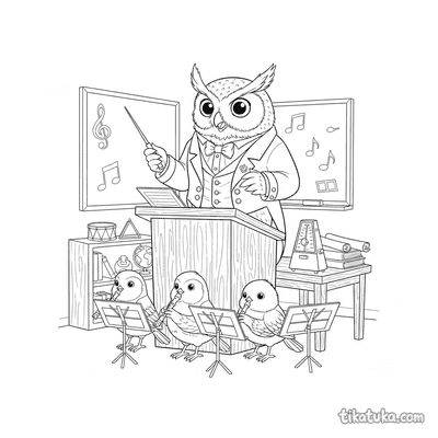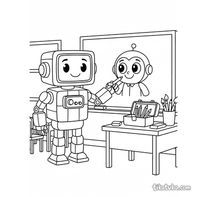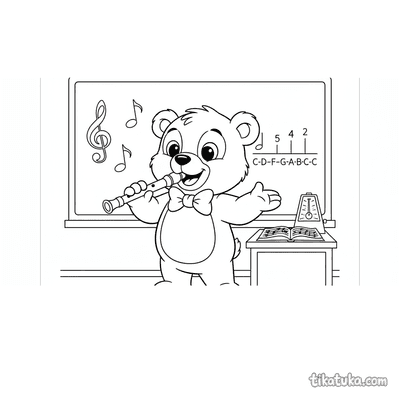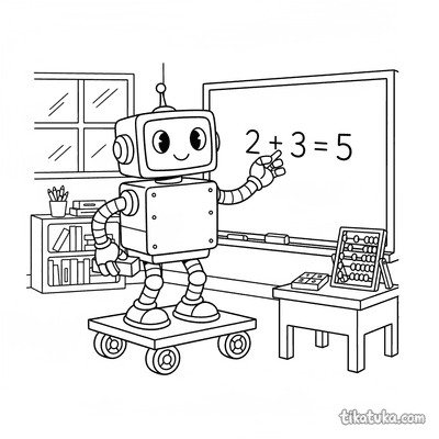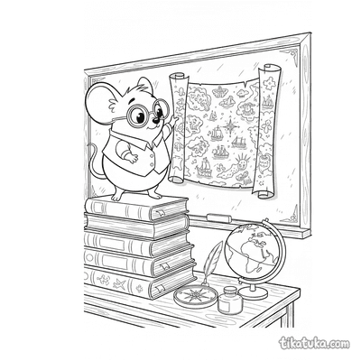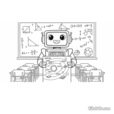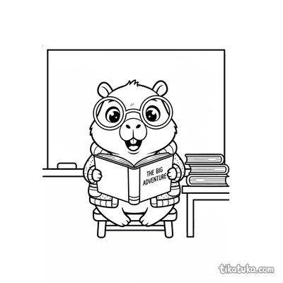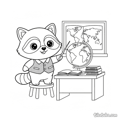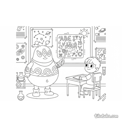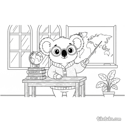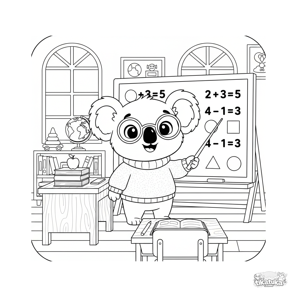 Página para colorir para crianças 4-6: um professor coala amigável com óculos explica um problema no quadro da sala de aula.