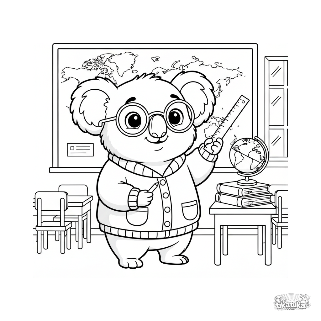 Página para colorir para crianças de 4-6 anos: um professor coala em uma sala de aula no quadro com um globo e livros didáticos.