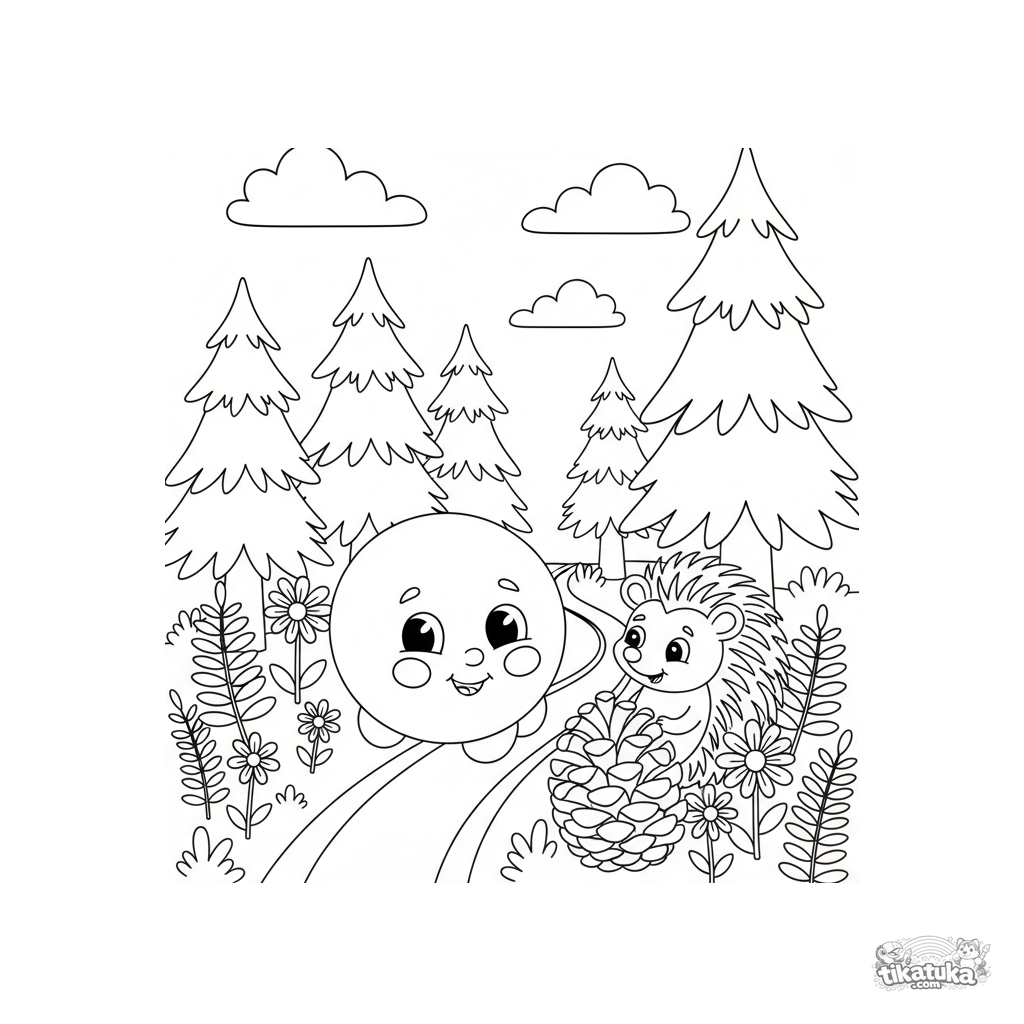 Página para colorir de um conto de fadas russo: Kolobok rola alegremente por uma trilha na floresta passando por um ouriço. Para 4-6 anos.