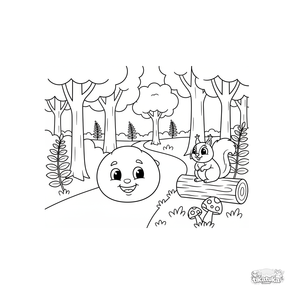 Página para colorir simples para crianças de 2-3 anos: o alegre Kolobok rola por uma trilha na floresta. Formas grandes, contornos claros.
