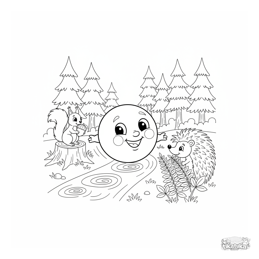 Página para colorir para crianças de 4-6 anos de um conto de fadas russo: o alegre Kolobok rola por uma trilha na floresta, passando por um ouriço e um esquilo.