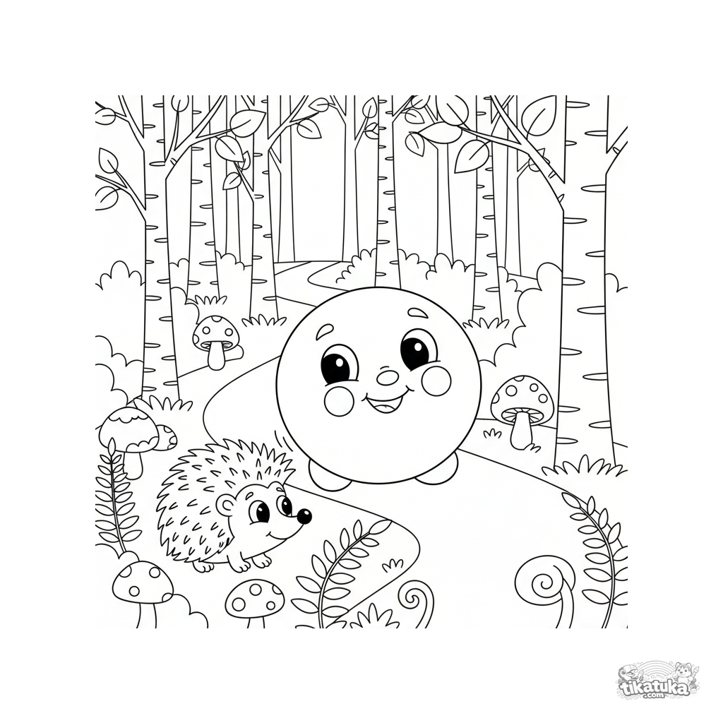 Página para colorir do conto russo: Kolobok rolando feliz por uma trilha na floresta perto de um ouriço. Para crianças de 4 a 6 anos.