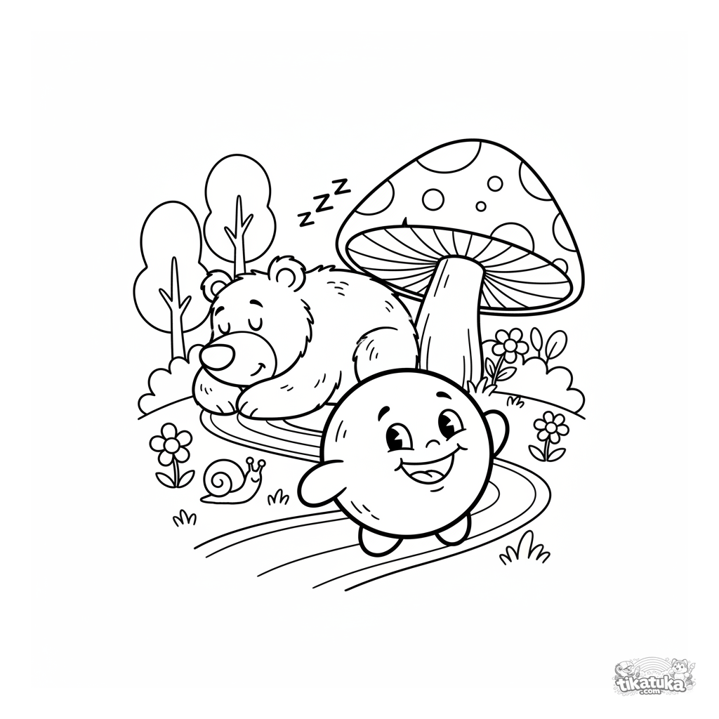 Página para colorir para crianças de 2-3 anos: Kolobok rola pela floresta passando por um urso dormindo. Formas muito simples e grandes, perfeito para os mais novos.