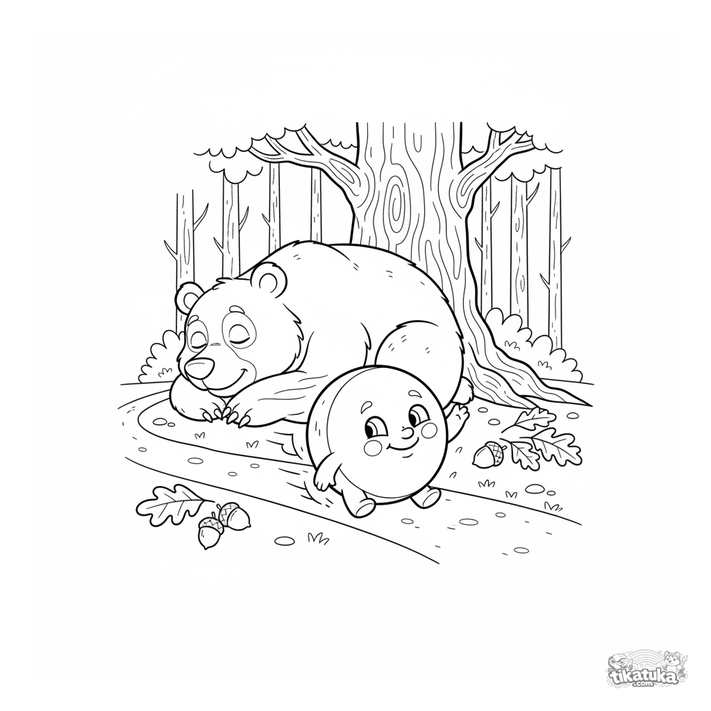Página para colorir para crianças 4-6: Kolobok rola por uma trilha na floresta passando por um urso dormindo sob um carvalho. Cena de um conto de fadas russo, personagens claros.