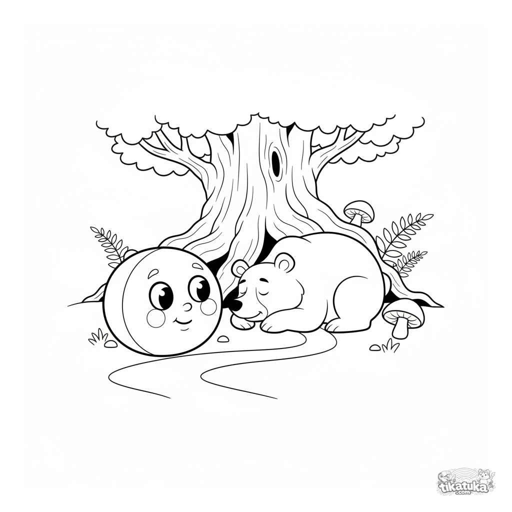 Página para colorir para crianças pequenas 2-3 anos: Kolobok rola pela floresta passando por um urso dormindo sob um grande carvalho. Formas simples.