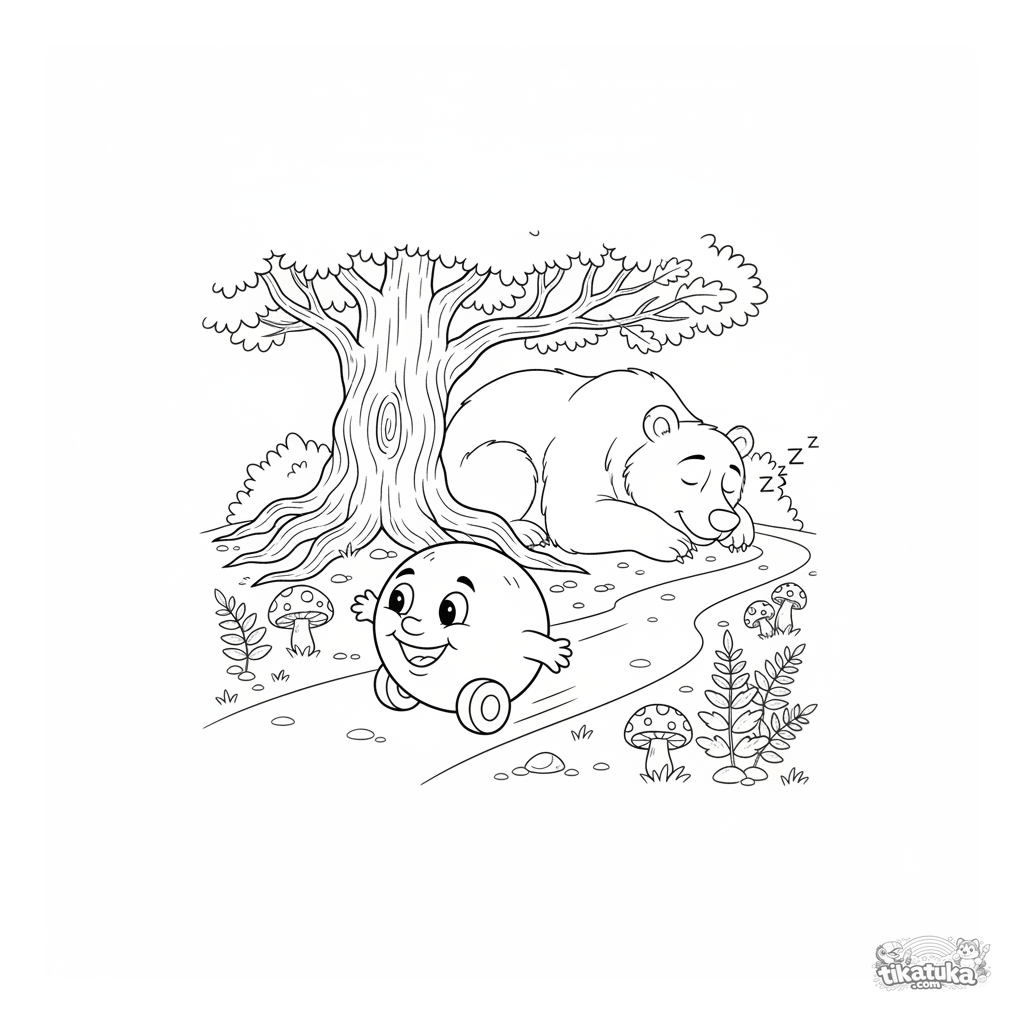 Página para colorir de um conto russo: Kolobok passa rolando por um urso dormindo. Para crianças de 4-6 anos, cena reconhecível e divertida.
