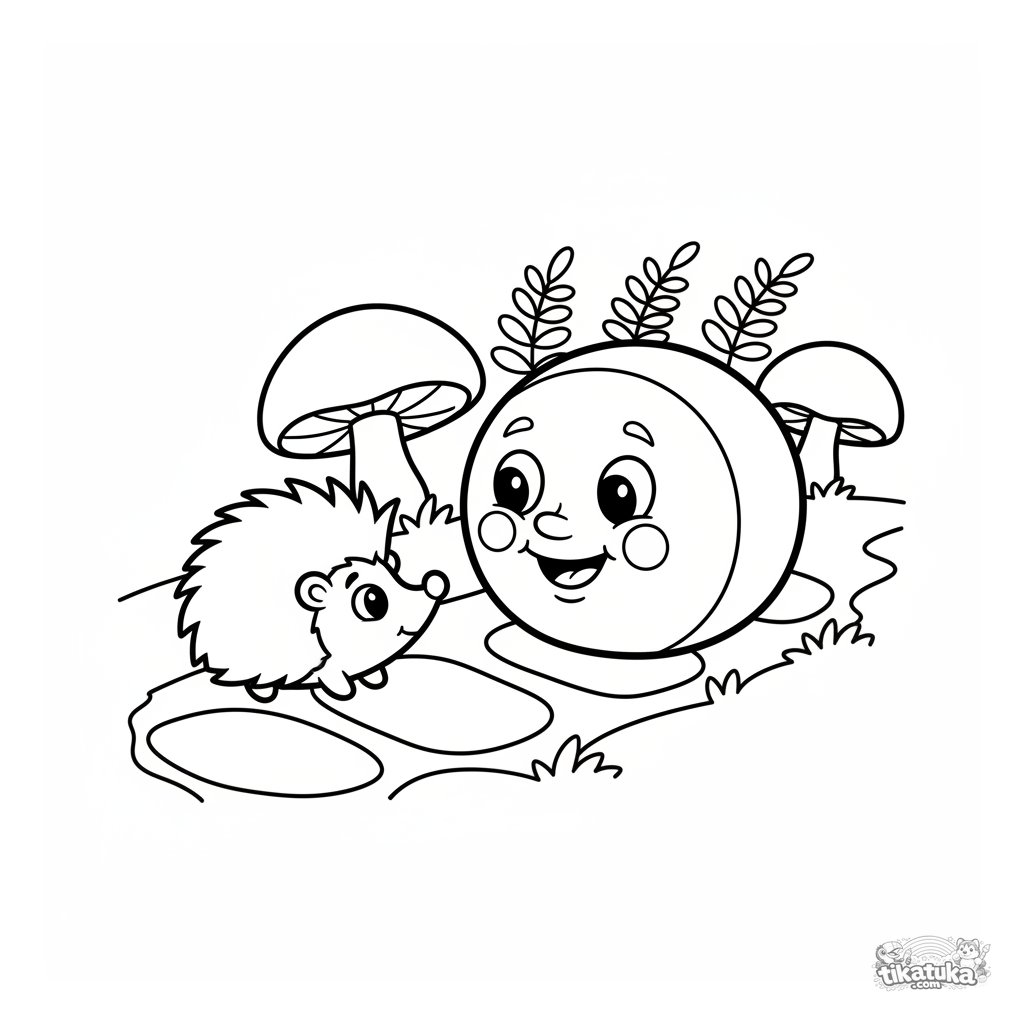 Página para colorir para crianças pequenas 2-3 anos: o alegre Kolobok do conto de fadas rola por uma trilha na floresta passando por um ouriço curioso.