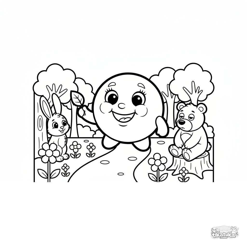Página simples para colorir para bebês de um conto russo: Kolobok rolando por uma trilha na floresta. Formas grandes e claras.