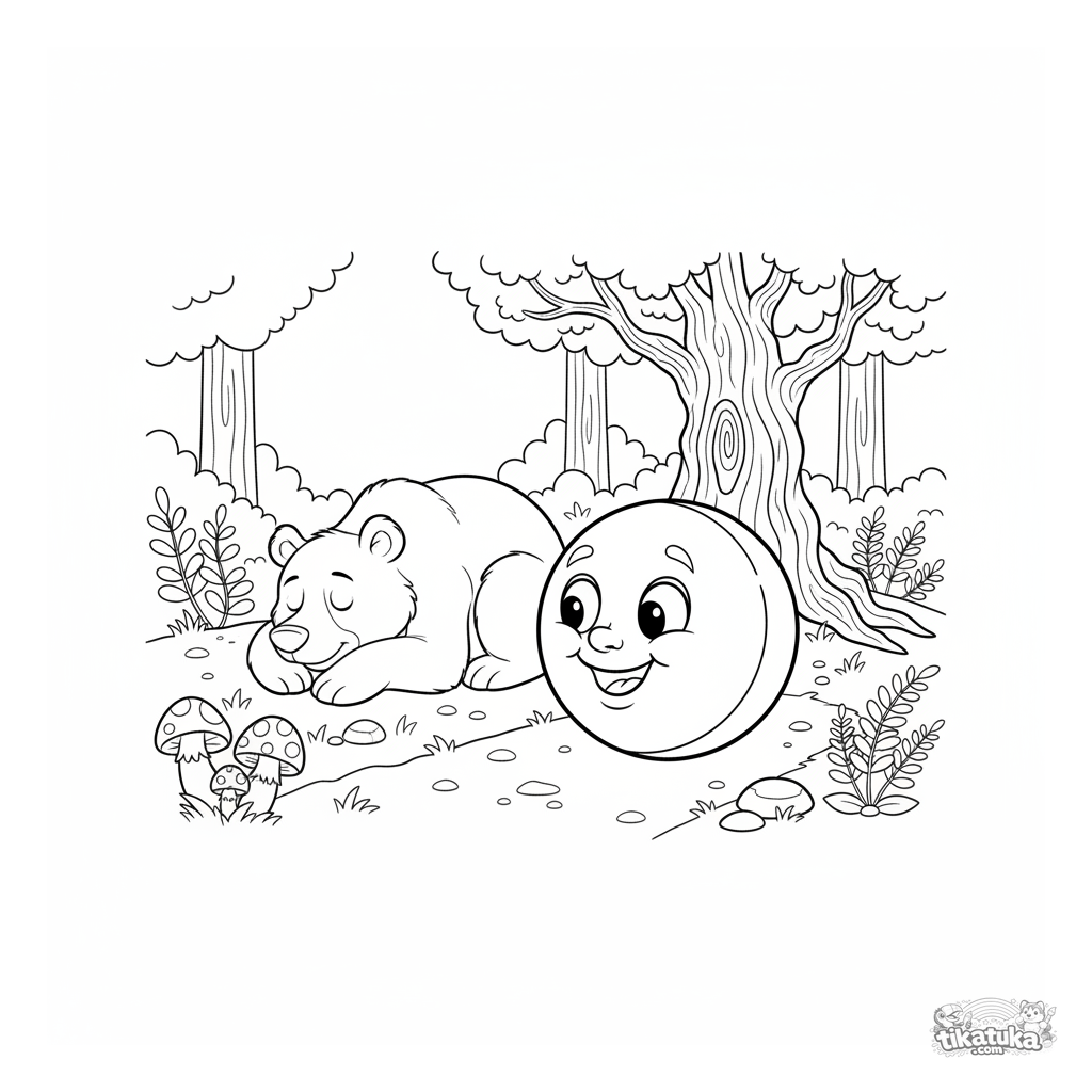 Página para colorir de um conto russo: Kolobok rolando pela floresta passando por um urso adormecido. Para crianças de 4 a 6 anos.