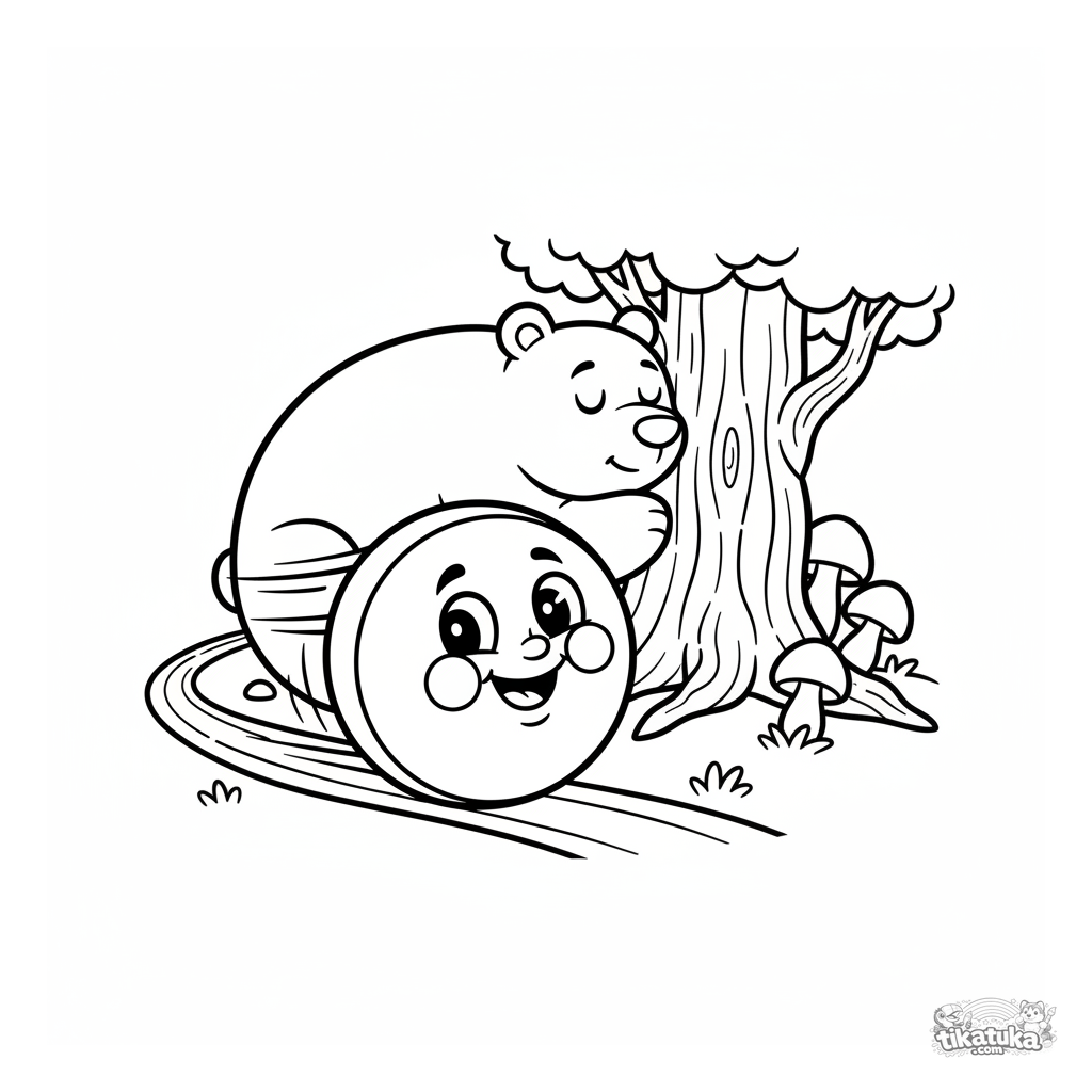 Página simples para colorir de um conto russo: Kolobok rola passando por um urso adormecido. Formas grandes, poucos detalhes.