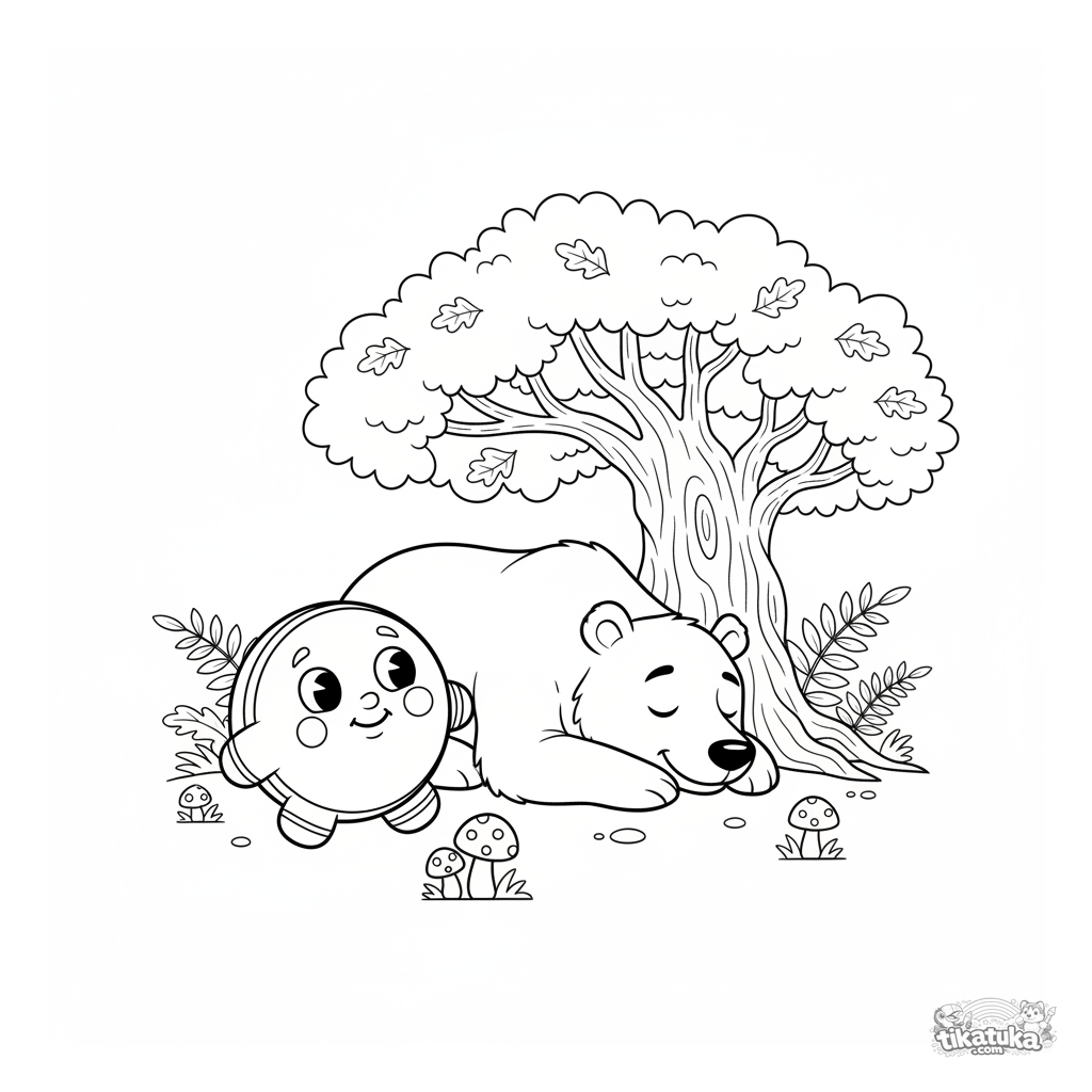 Página para colorir de um conto de fadas russo para crianças de 4-6 anos: Kolobok, o homem de gengibre, passa por um urso dormindo. Cena folclórica reconhecível.