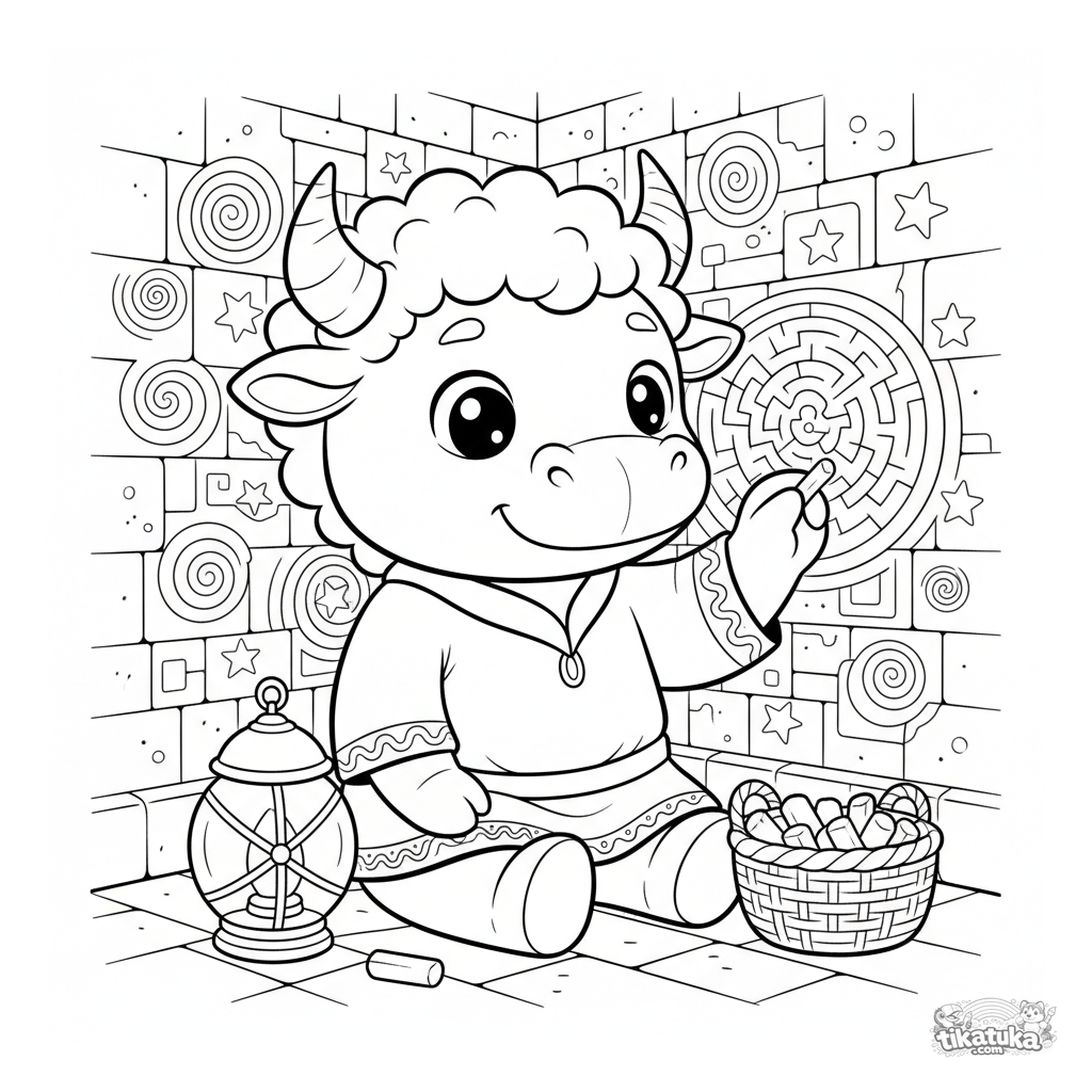 Página para colorir para crianças de 7-12 anos: um minotauro artista gentil desenha com giz nas paredes de um grande salão de labirinto. Cena detalhada no estilo de quadrinhos de aventura.