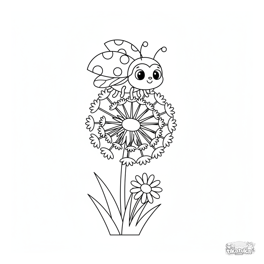 Página simples para colorir de uma joaninha num dente-de-leão para crianças pequenas de 2-3 anos. Formas grandes e claras com margens amplas para colorir.