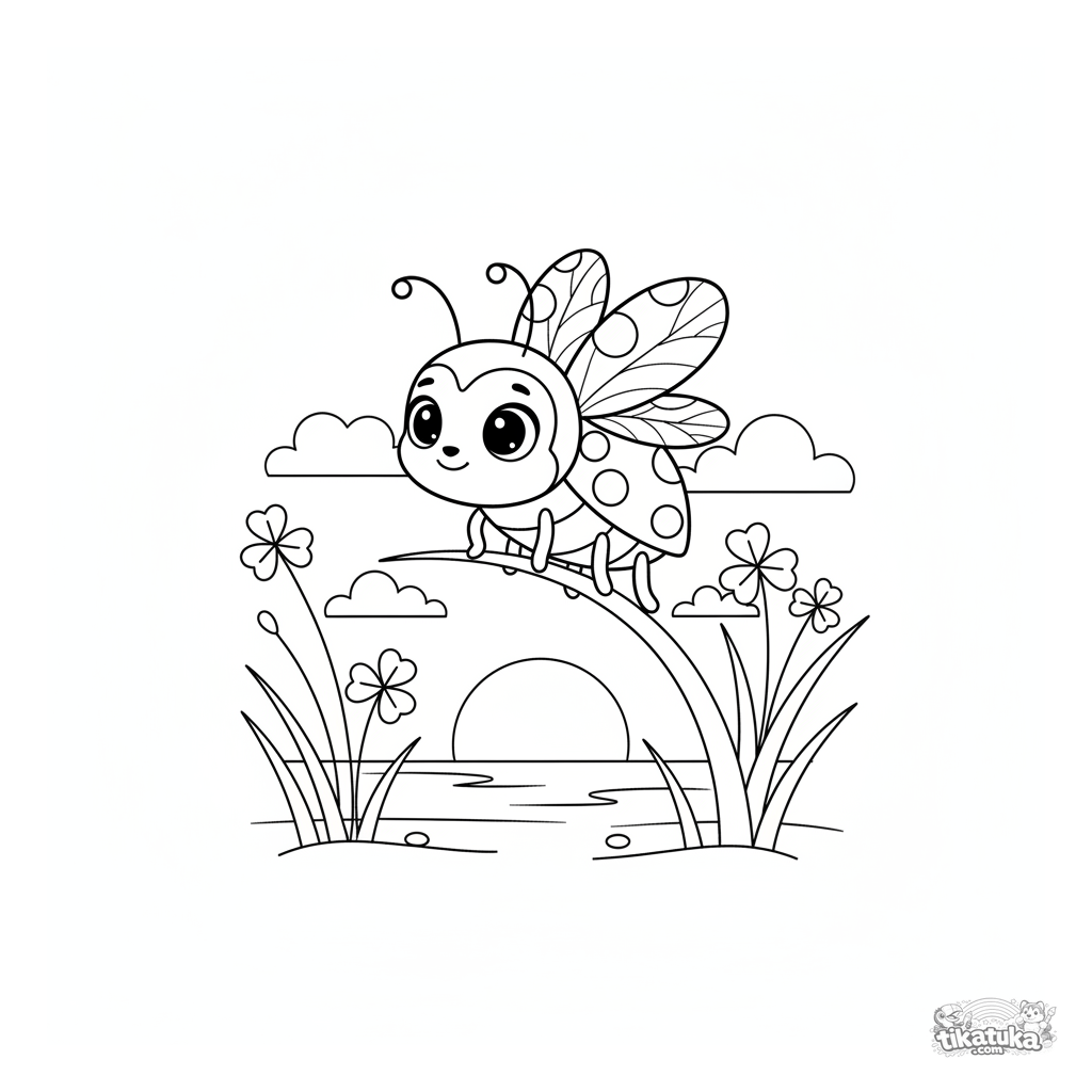 Página para colorir para crianças: uma joaninha se equilibra numa lâmina de grama ao pôr do sol. Contornos claros e detalhe moderado.