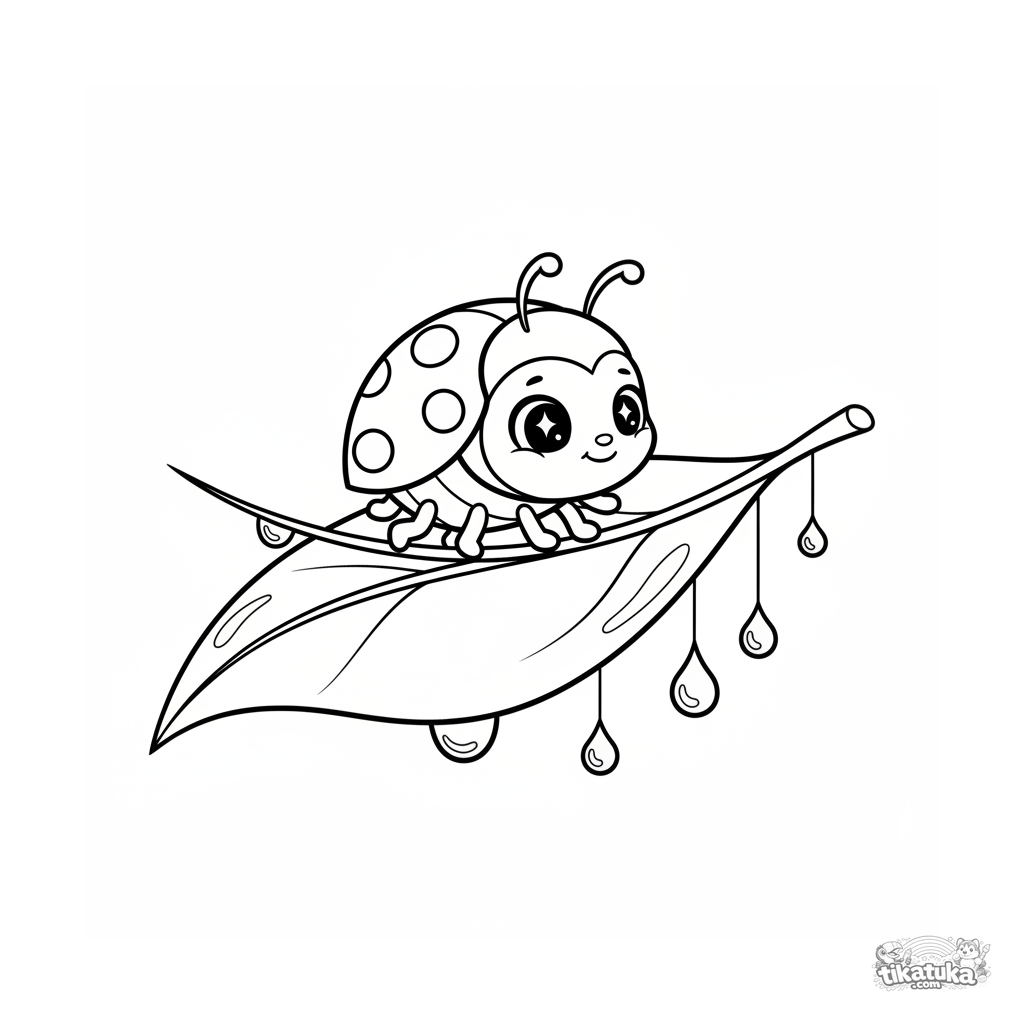 Página para colorir simples para crianças pequenas de 2-3 anos: uma joaninha fofa se equilibra em uma corda de orvalho em uma folha grande. Formas grandes e claras.