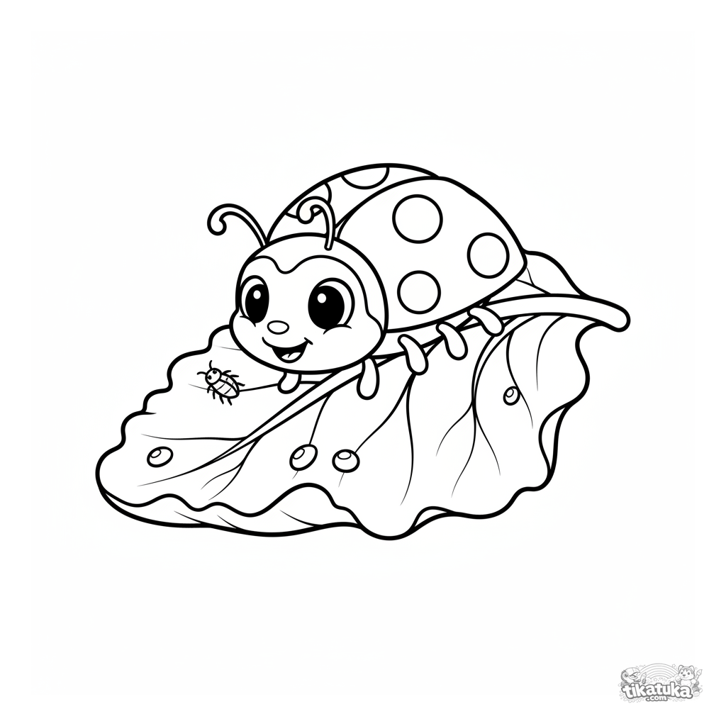 Página simples para colorir para crianças de 2-3 anos com uma joaninha. A joaninha rasteja em uma folha grande e enrolada em uma horta.
