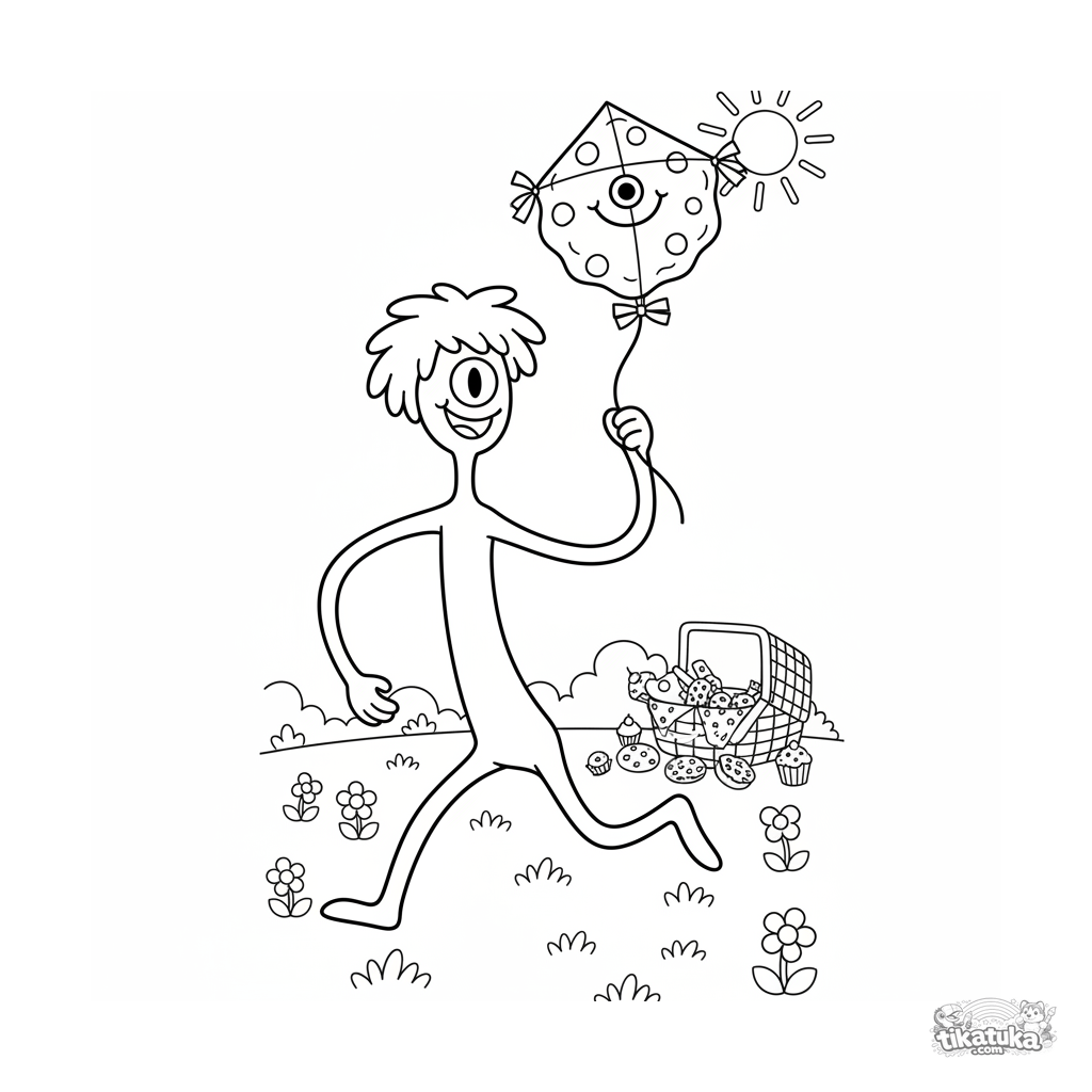 Página para colorir para crianças de 4-6 anos: um monstro magro e alegre corre soltando uma pipa em forma de biscoito. Cena dinâmica.
