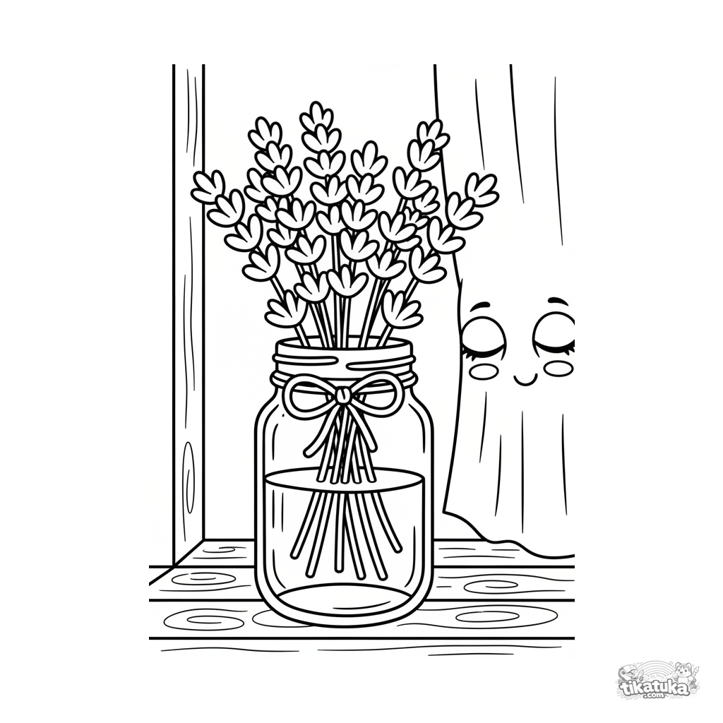 Página para colorir para crianças 7-9: um buquê aconchegante de lavanda em um pote de conserva em um parapeito de madeira. Cena com fundo e acessórios.